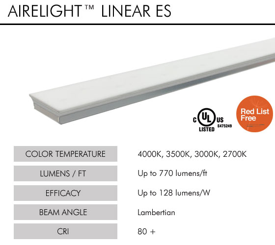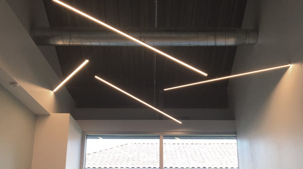 Suspended LED linear lighting offers versatility and a modern aesthetic. While the installation shown above exhibits a free floating style, Airelight pendants can also be linked together end to end to create geometric shapes or longer runs of linear lighting. These versatile pendants can be installed to provide either up or downlighting. Each 6′ Airelight Suspended Pendant light is comprised of three 24″ Airelight Linear ES 1.0 LED Ceramic Luminaires.
