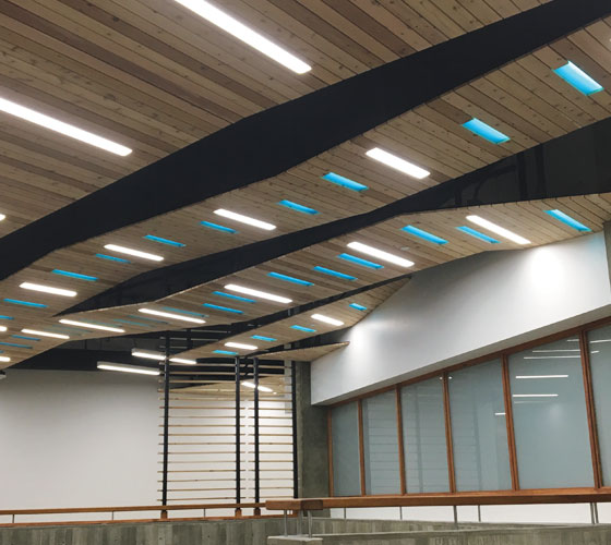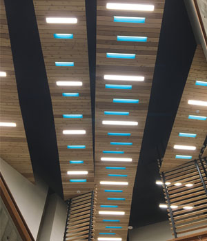 Designed to reflect the coastal cliffs of La Jolla, California and nearby Pacific Ocean, this architectural ceiling provides a beautiful light source to the common area of a prestigious university. Airelight™ Linears illuminate each blue glass panel and pay tribute to the natural environment by using 50x less materials than conventional LED lighting fixtures. Airelight™ Luminaires are also 100% recyclable making them the superior option for sustainable building design.